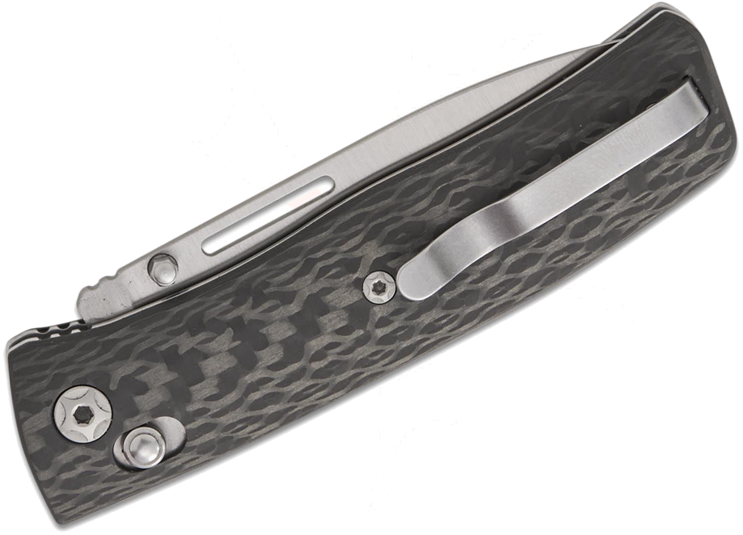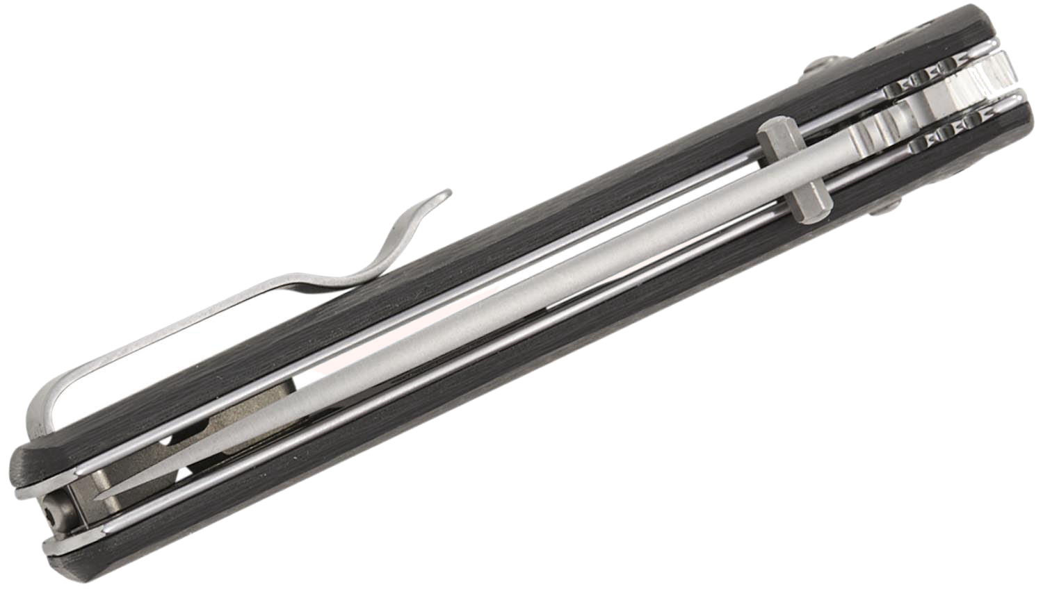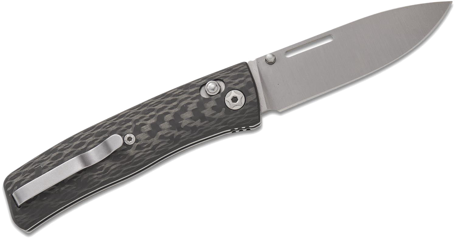 一種為搭配噴砂鈦金屬 Bolster(前端護片),另一種則採用延伸式握柄設計,覆蓋拋光不鏽鋼內襯。口袋夾可左右互換,並固定於鈦合金間隔柱上,使其同時適合左右手使用者。