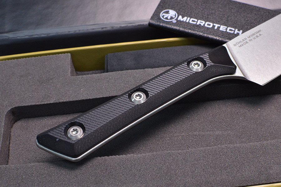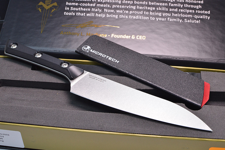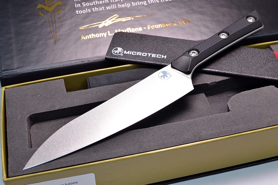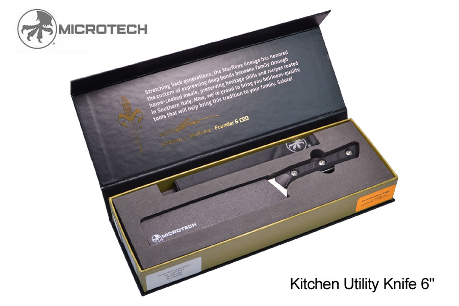 Microtech Kitchen Utility Knife 6" M390MK Stonewashed Blade, Black G10 Handles