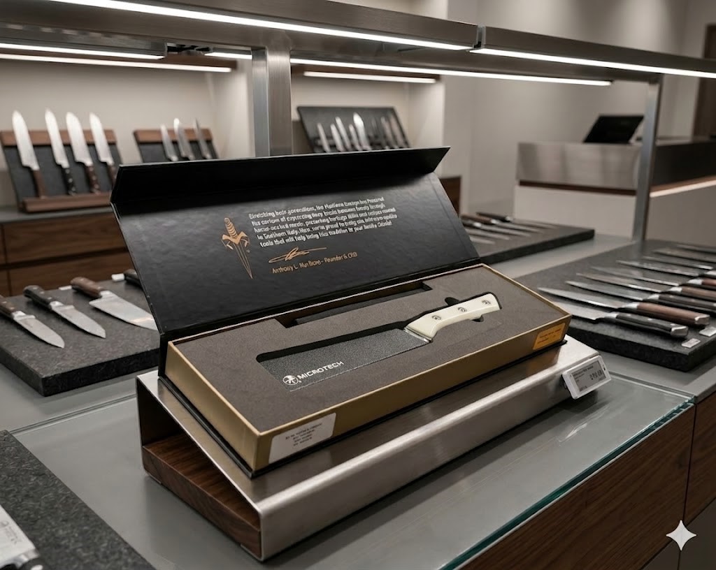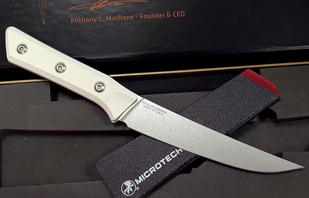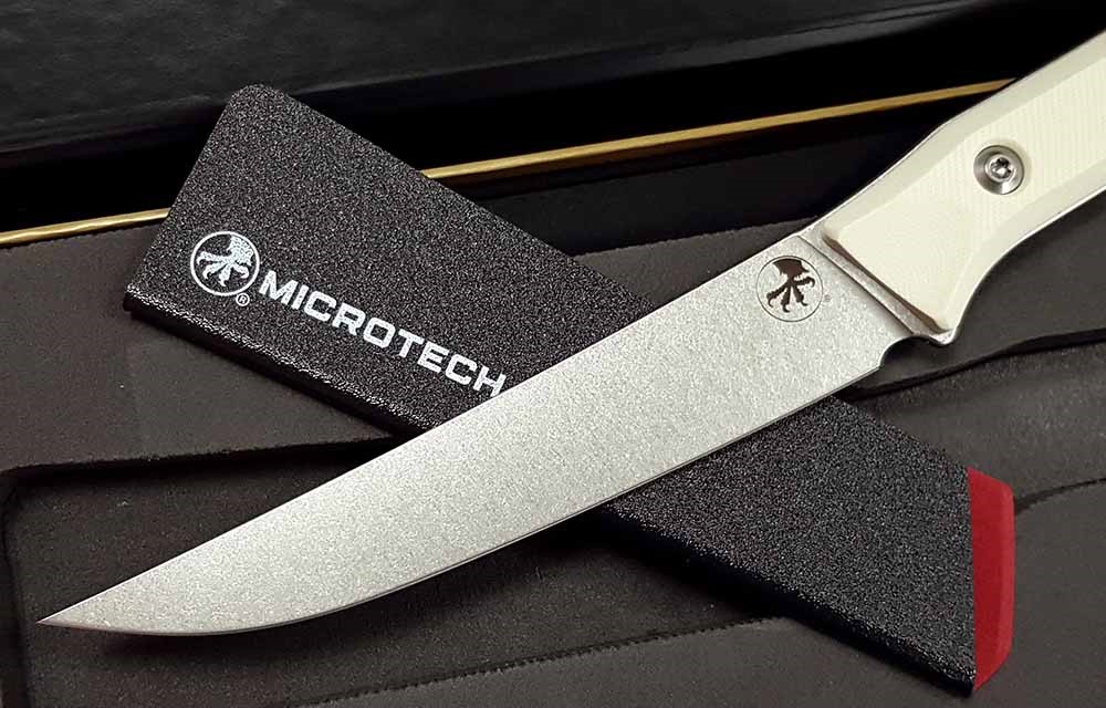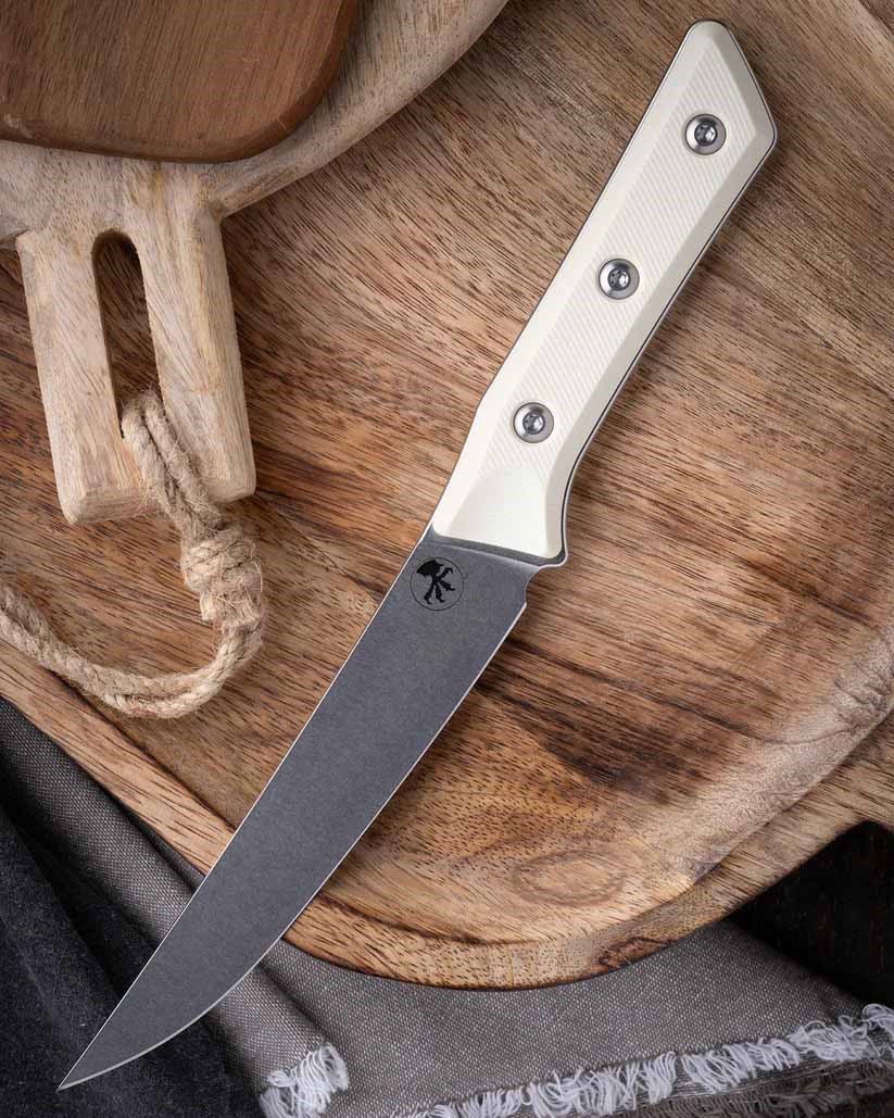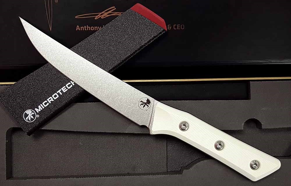 Microtech Kitchen Boning Knife br> M390MK Stonewashed Blade, Ivory G10 Handles