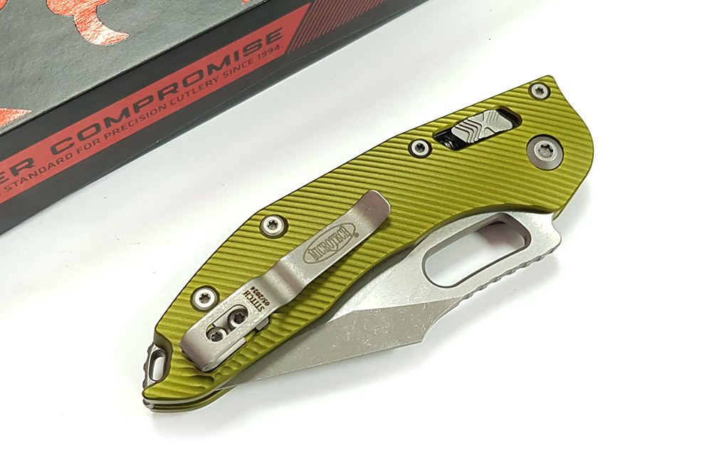 Stitch RAM-LOK 於 2023 年發布,它是隨 MSI(Microtech標準版)首次亮相,成為Microtech首款採用出色 RAM-LOK 技術的刀款。這款強硬的橫桿鎖(Cross Bar Lock)採用了Microtech的標誌性階梯圖案,該圖案因 Ultratech 系列上的指推開關而聞名。