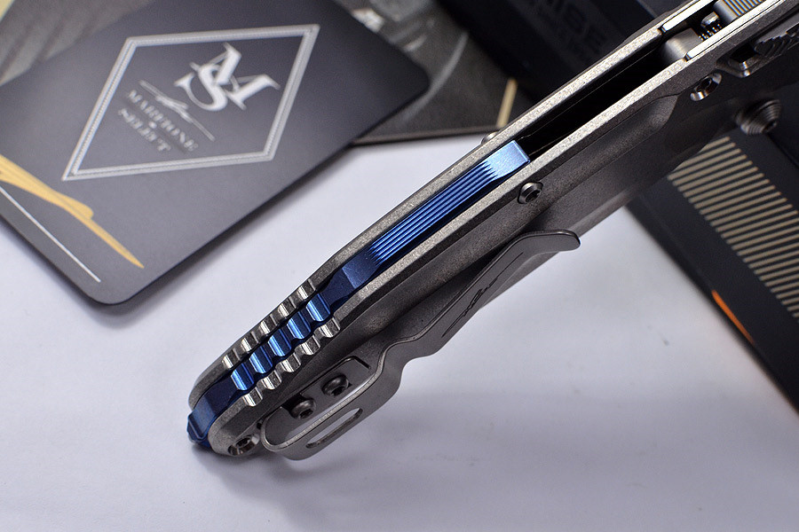 M390MK Stonewashed Spear Point Blade and Contoured Titanium Handles, Blue Accents, Reversible Clip, AXIS/Crossbar Lock
