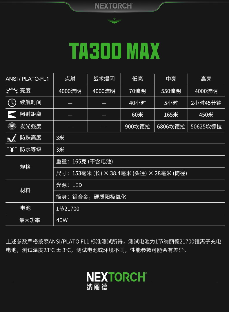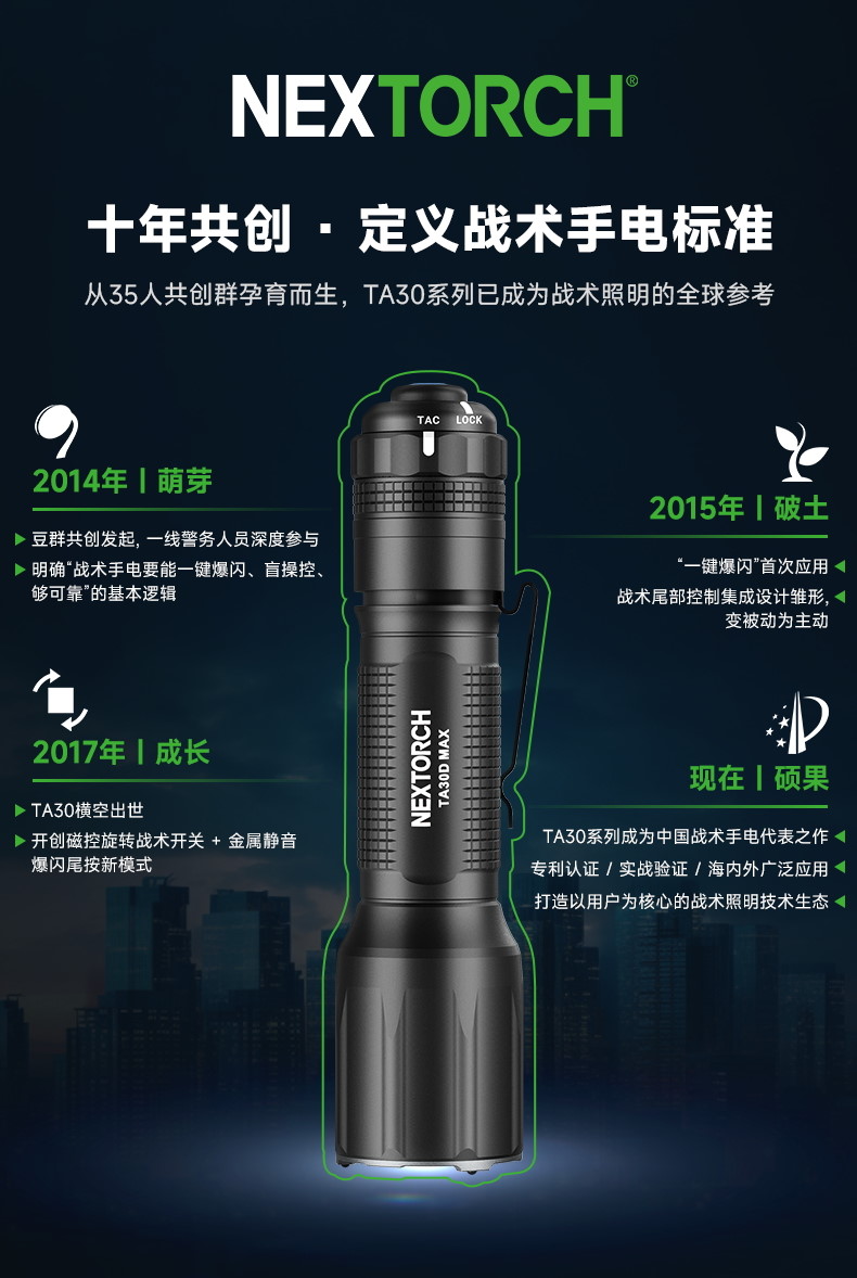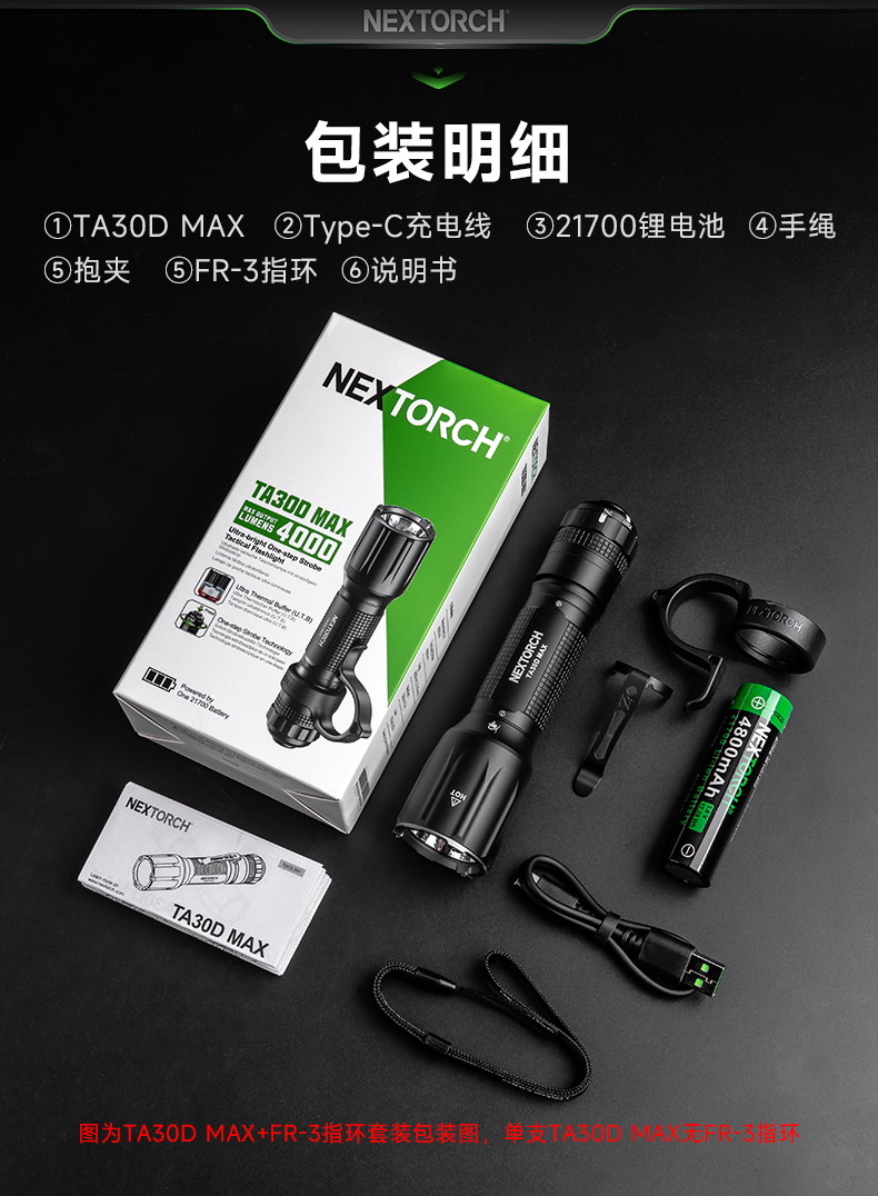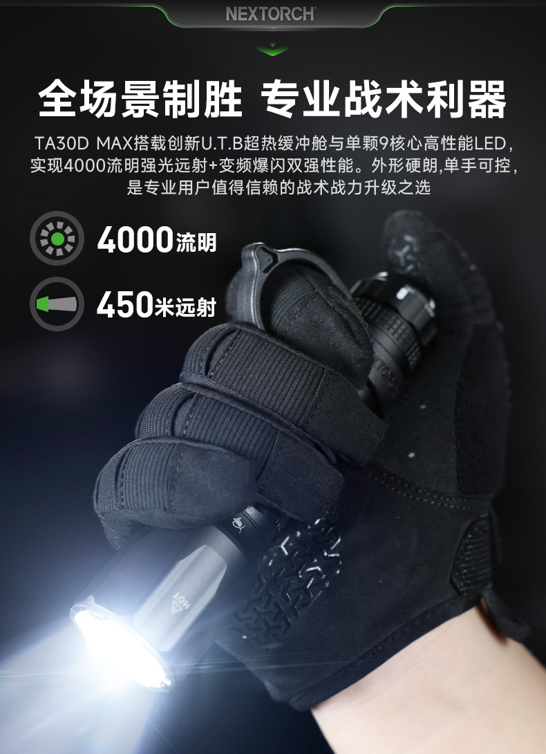TA30D MAX,戰術手電與搜尋手電筒二合一,小巧硬朗,單手可控,戰力破格,帶來高性能照明體驗。搭載單顆LED,可實現4000流明超高亮輸出,遠射450公尺。自主研發UTB超熱緩衝艙,確保長時間穩定高亮。尾部金屬雙階戰術開關與旋轉磁控開關,操作順暢精確,一鍵變頻爆閃實現戰術壓制。 Type-C直充21700電池,尾部LED電量顯示,續航狀態一目了然。陶瓷珠攻擊頭、一體成型鋁合金筒身,3公尺防跌落+3公尺防水,堅固可靠。標配易拆裝抱夾,可選FR-3戰術指環、V55L-XCarry等,多場景靈活適配。
