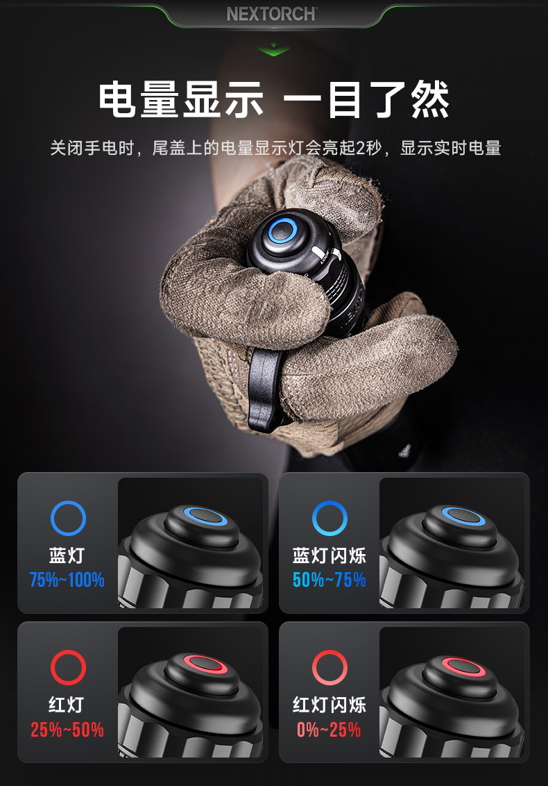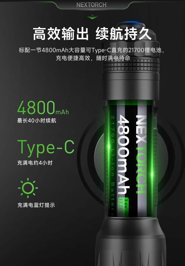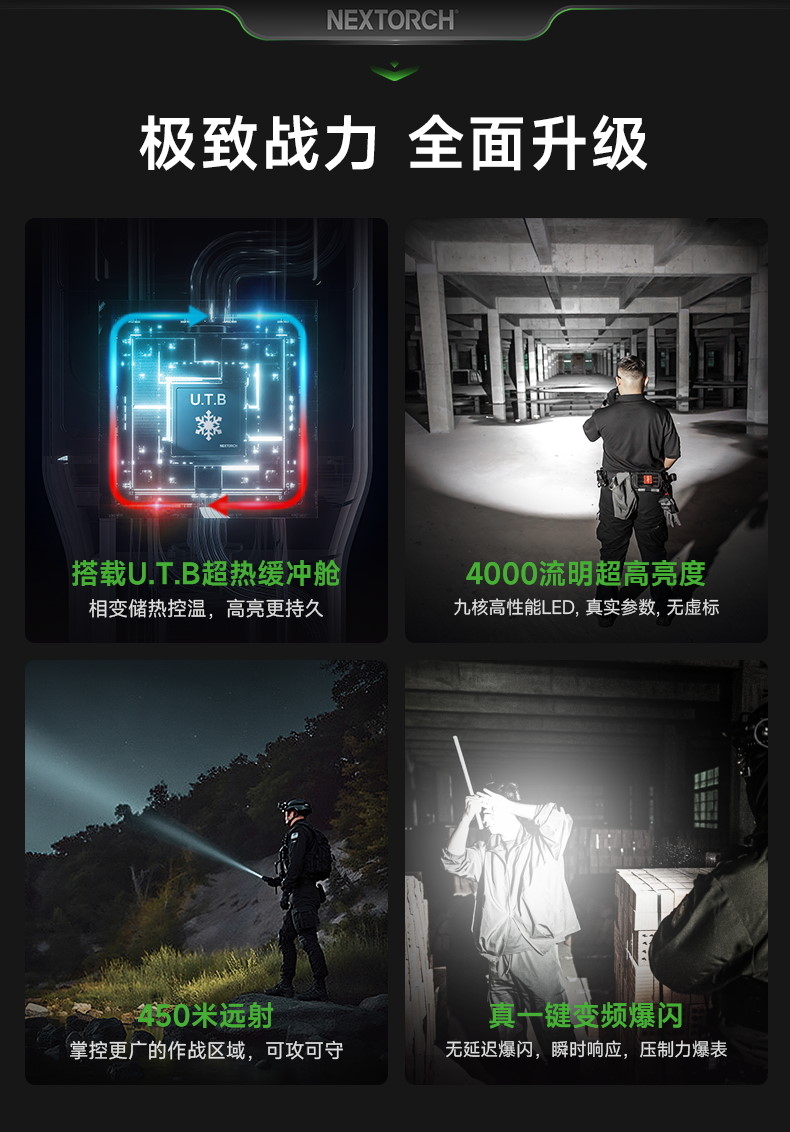 這款精英手電筒配備一顆高性能 9 芯 LED 和 NEXTORCH 的超熱緩衝 (UTB) 系統,可輸出 4000 流明的亮度,照射距離可達 450 米,同時保持舒適的握持溫度。