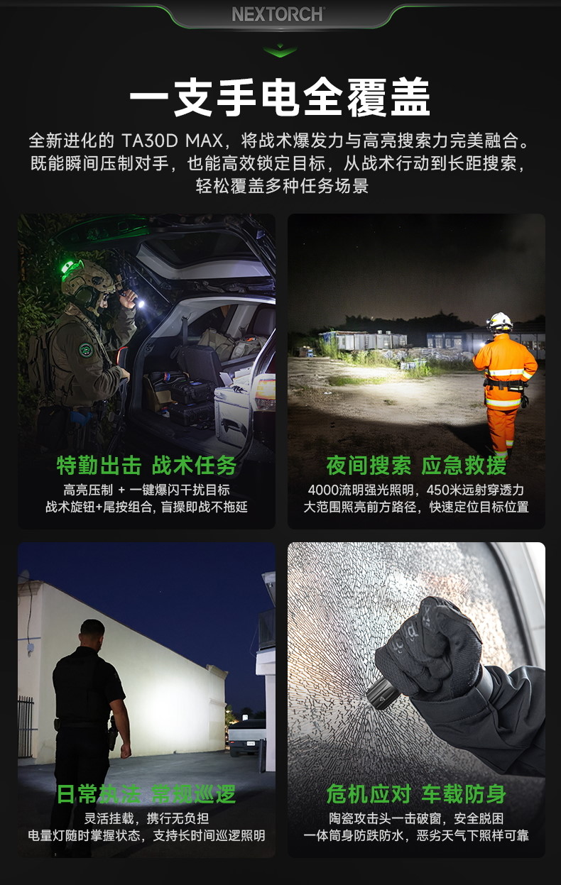 TA30D MAX 專為執法、搜救和專業響應團隊設計,配備專利的「一步式頻閃」系統,可即時進行防禦壓制;尾部磁性旋轉開關,可實現快速、盲控操作;以及鈦灰色奈米陶瓷防撞邊框,可用於玻璃破碎和緊急情況下使用。它堅固耐用、防水抗衝擊,專為最艱鉅的任務打造。