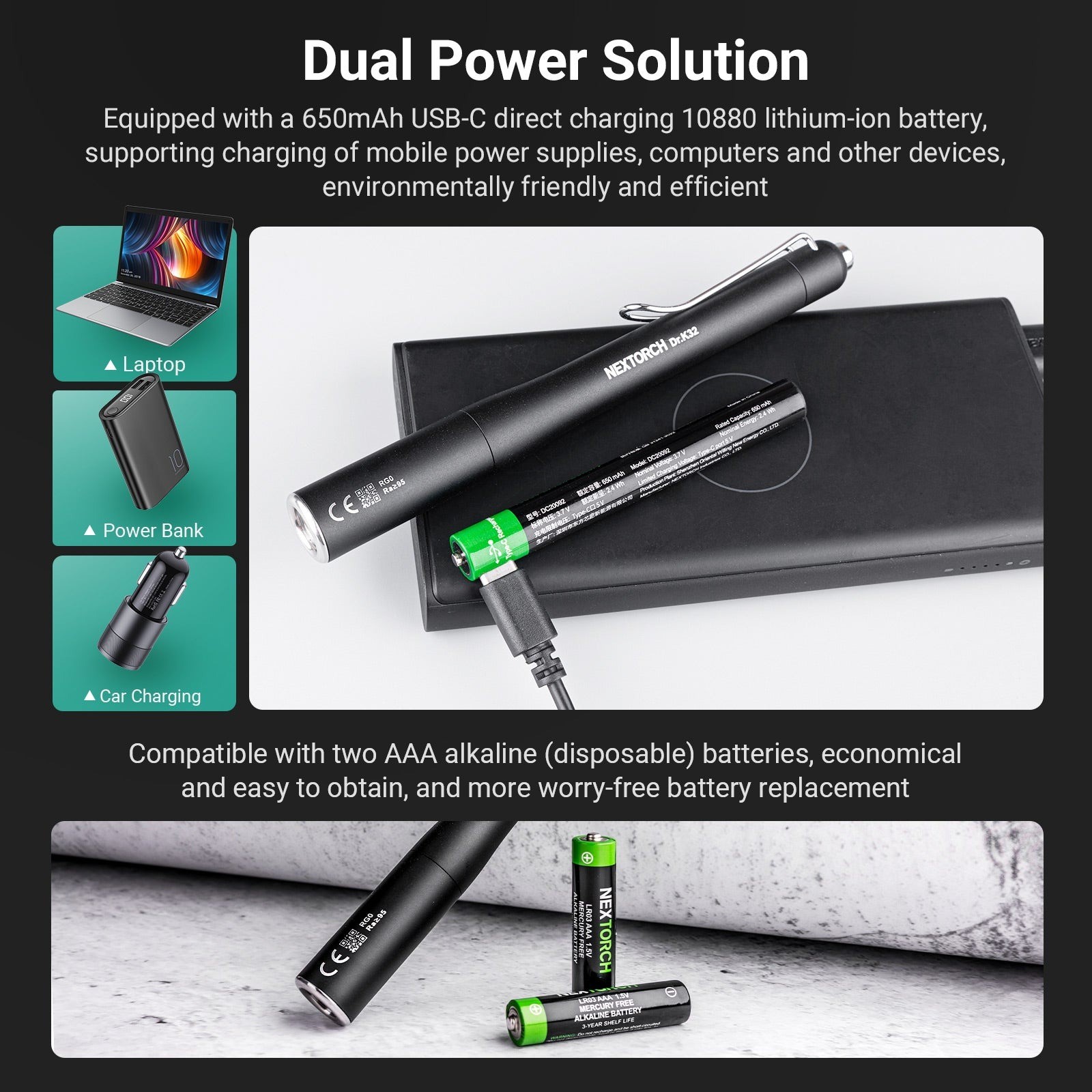 雙電源系統:鋰離子可充電電池與 AAA 備用電池,確保長班次可靠運行。