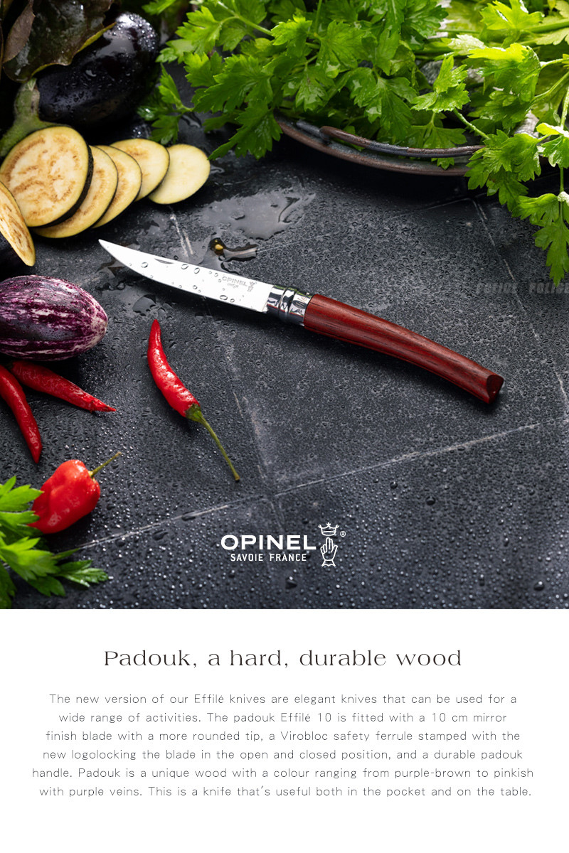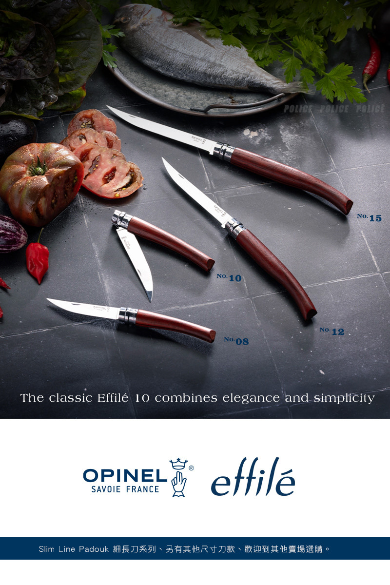 Opinel Effilé,前身為 Slim Line,是 Opinel 旗下這款優雅口袋刀系列的全新名稱。 Opinel Effilé 口袋刀提供多種尺寸,並配有各式奢華的木質刀柄! Effilé 系列的全新標誌印刻在金屬刀柄護套上。