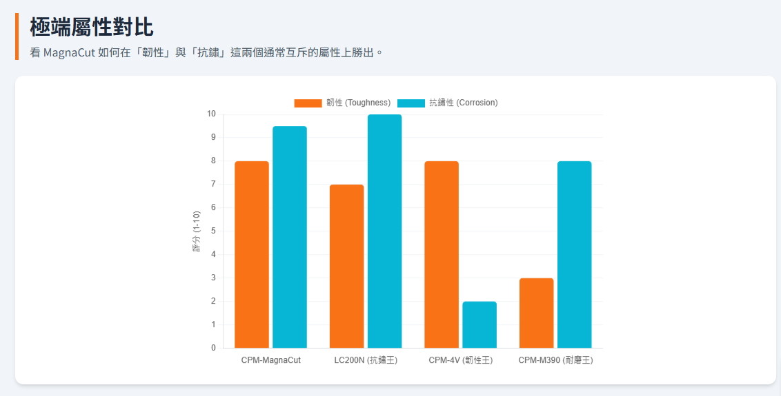 ●頂級鋼材 (CPM-MagnaCut): 採用目前刀界最受推崇的 MagnaCut 不鏽鋼,完美平衡了高硬度、優異的韌性以及極致的抗腐蝕性。