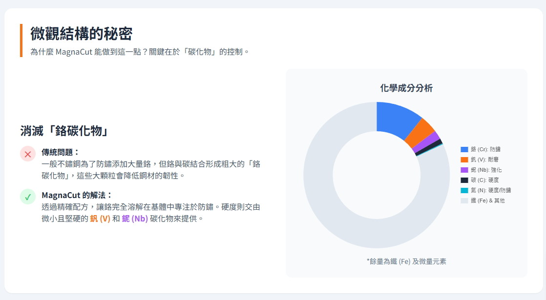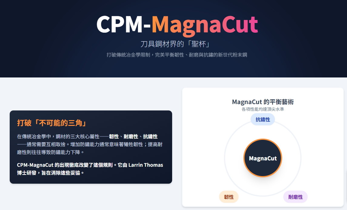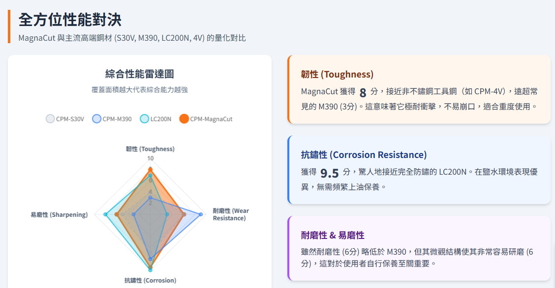 ●MX101 最大的賣點之一是使用了 CPM MagnaCut 粉末鋼。這是目前刀具界最先進的「超級鋼材」: 平衡性極佳: 在保持性(Edge Retention)、韌性(Toughness)與抗腐蝕性(Corrosion Resistance)三者之間達到了極高平衡。