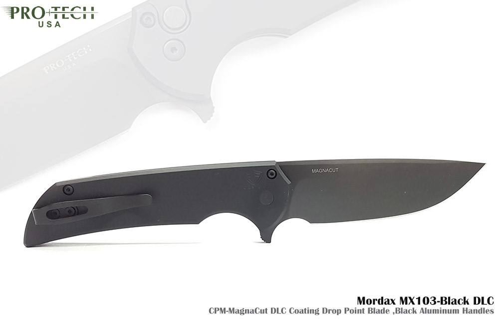 Pro-Tech Mordax MX103-DLC 是 Mordax 系列中最具「戰術感」且低調的版本。與 MX101-PURPLE 最大的不同在於其**全黑化(Blackout)**的配置以及更強大的表面保護塗層。