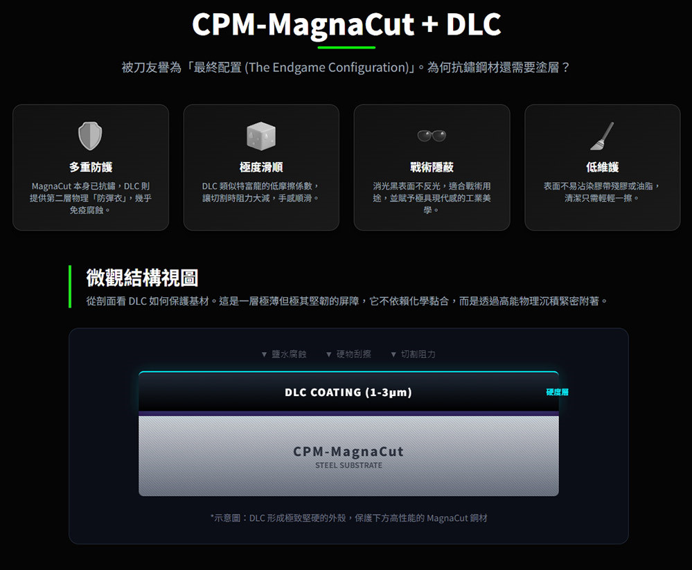 「DLC」(Diamond-Like Carbon)是這款刀的核心賣點: