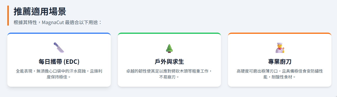 同樣採用目前頂尖的 MagnaCut 鋼材。在 DLC 塗層的保護下,這款本就具備高防鏽性能的鋼材幾乎達到了「免維護」的等級,非常適合在潮濕環境或高強度作業下使用。