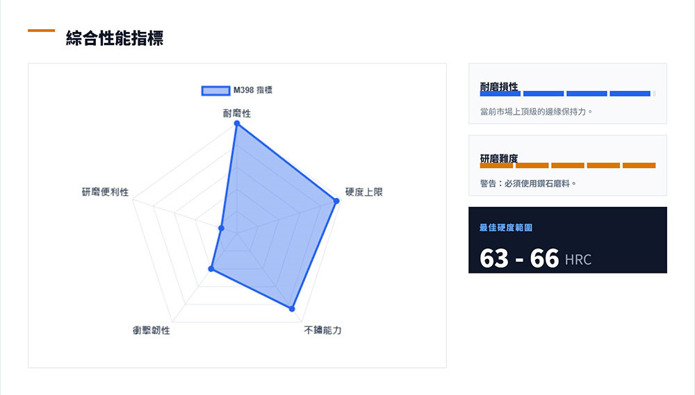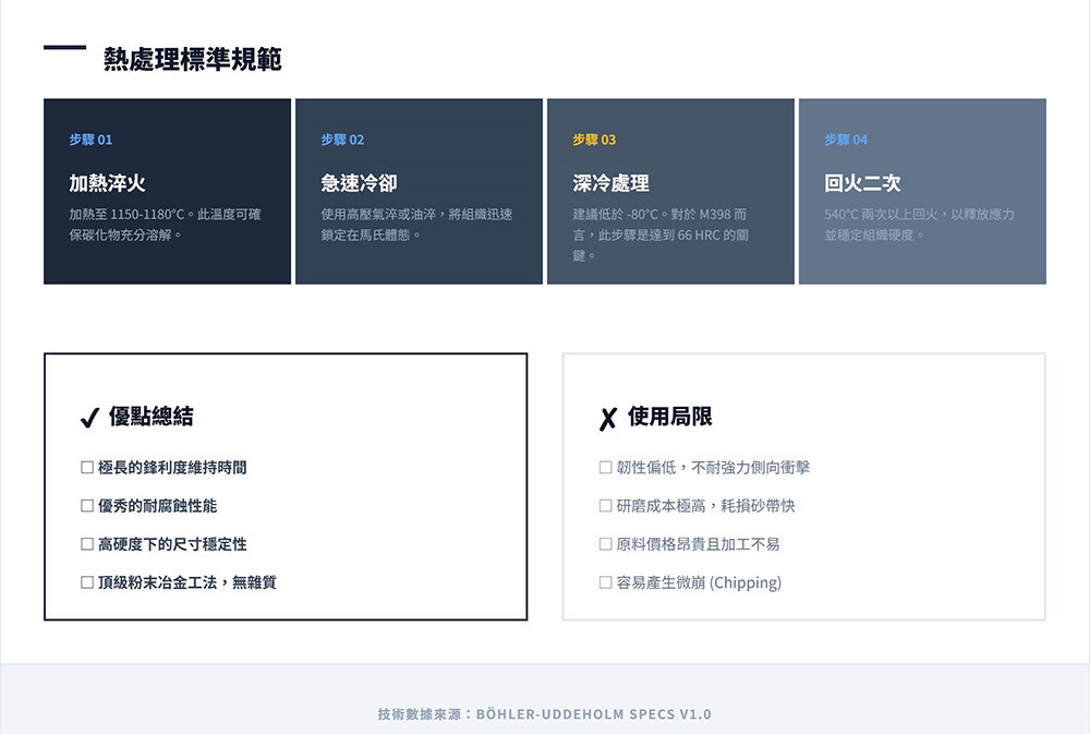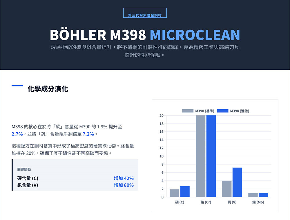 ●鋼材: 主要採用 Böhler M398 粉末鋼,具有極佳的防鏽性與保持性。