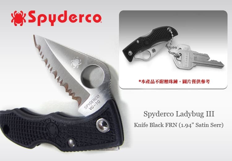 Spyderco 公司出品的鑰匙圈小刀中,就屬「小瓢蟲」最受到歡迎。Spyderco最小的輕量刀款 ,它折合時的尺寸只有6.2公分,握柄底有穿繩孔能搭配尾飾或鑰匙圈使用,是最理想的為鑰 匙鏈隨身攜帶刀,FRN玻璃纖維強化尼龍材質的握柄相當輕盈,總體重量才19公克,帶在身 上一點也不會有負擔。