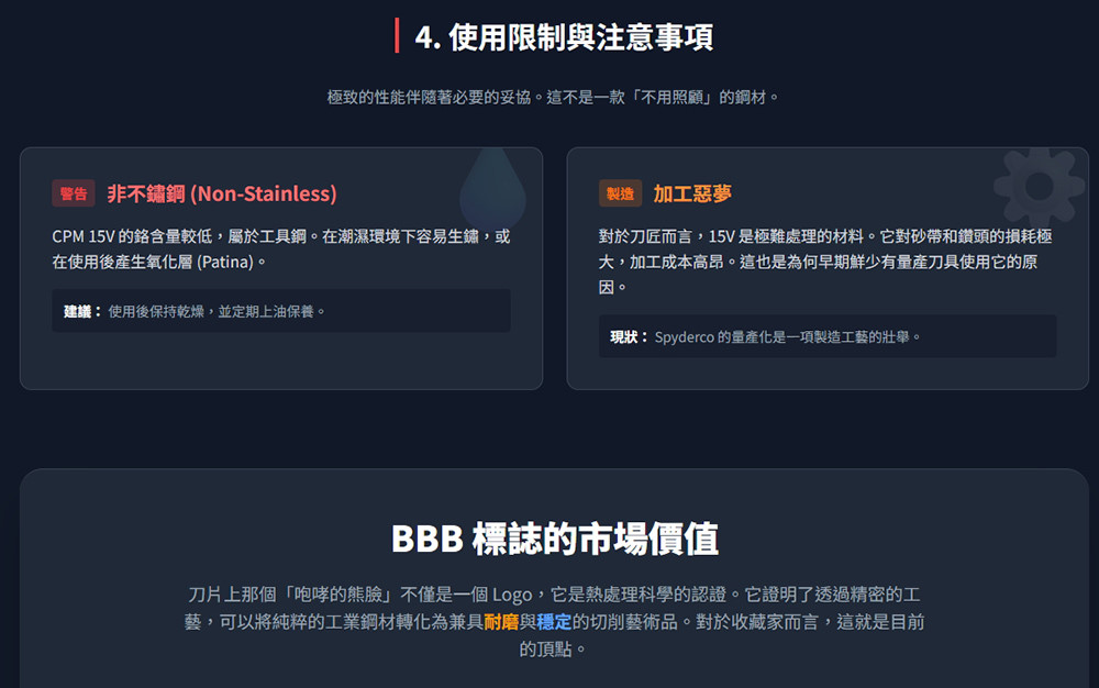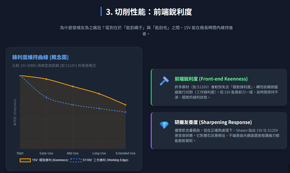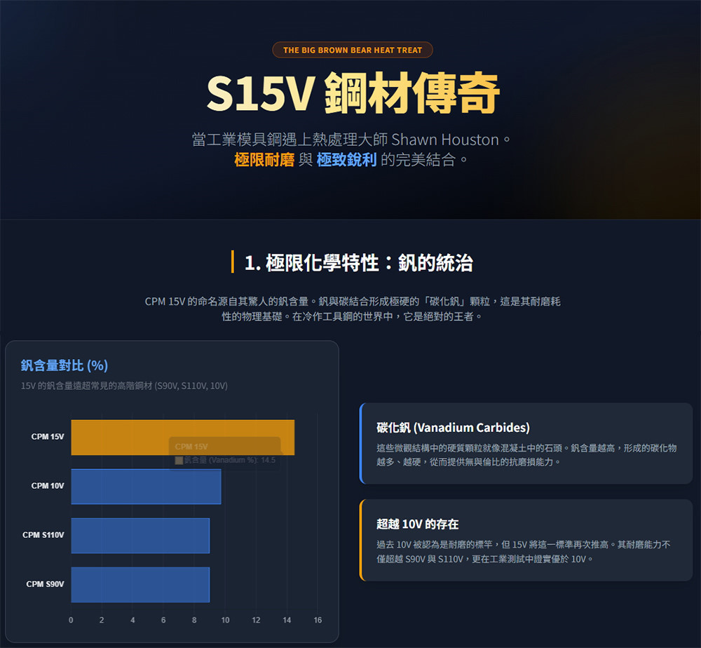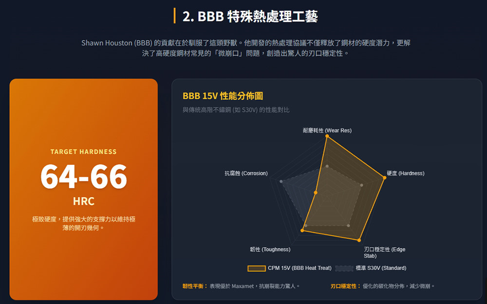 Shawn Houston(在刀具社群中常被稱為 Big Brown Bear 或 BBB)所推廣並與 Spyderco 合作的 CPM 15V 鋼材(使用者常誤稱為 S15V,因其性能與 S 系列不相上下,但本質是工具鋼),是近年來刀具界公認的「性能天花板」之一。