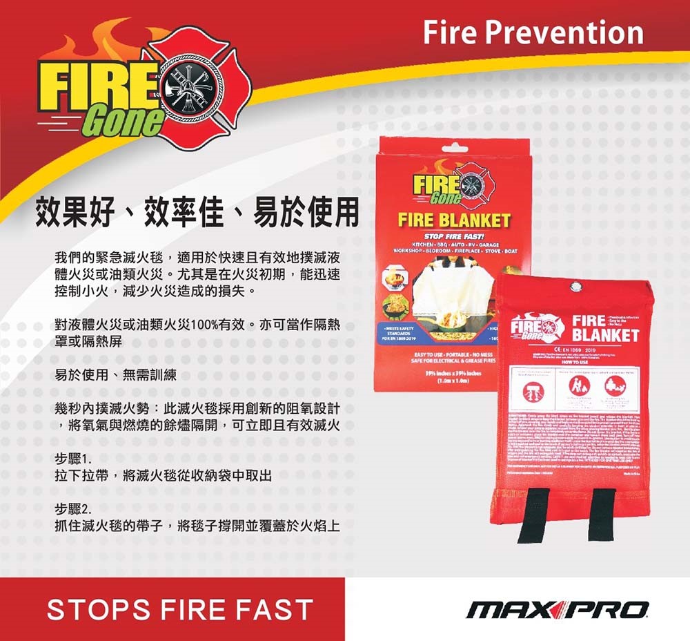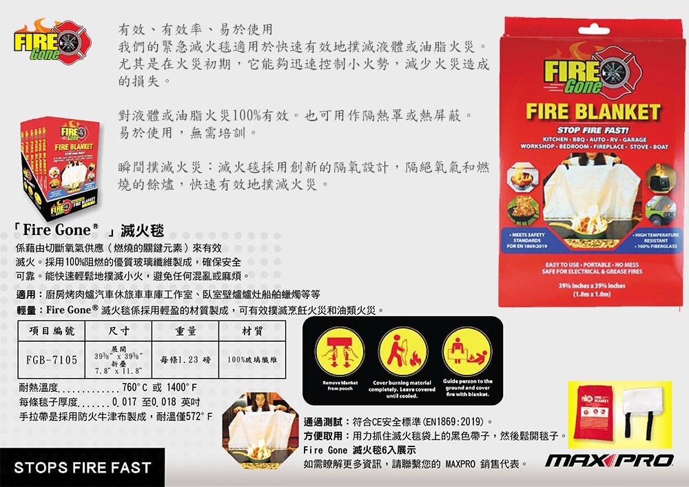 ●Fire Gone Fire Blanket®符合安全標準 EN 1869:2019。CE認證,符合CE安全標準。