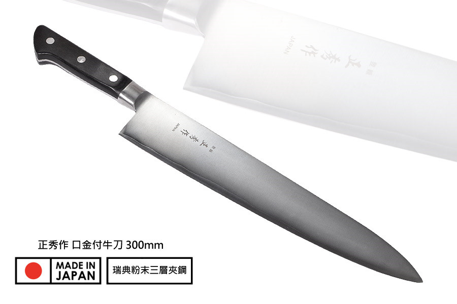 正秀作 口金付牛刀300mm黑檀木柄(瑞典粉末鋼三層夾鋼)