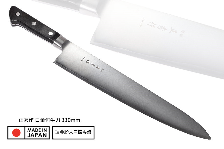 正秀作 口金付牛刀330mm黑檀木柄(瑞典粉末鋼三層夾鋼)