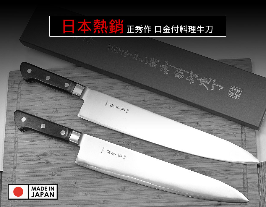 「正秀作」是日本知名的刀具品牌,以其卓越的鋼材處理技術與鋒利度聞名。「牛刀」(Gyuto)則是日式的萬用廚刀(相當於西式主廚刀),其長度適中、刀尖尖銳,非常適合處理肉類、魚類以及切碎蔬菜。 刀刃採用瑞典粉末鋼三層夾鋼精心打造,職人的鍛造技術讓日本廚刀擁有高硬度及高韌性夾鋼線清晰自然,黑檀木握柄自然雅緻