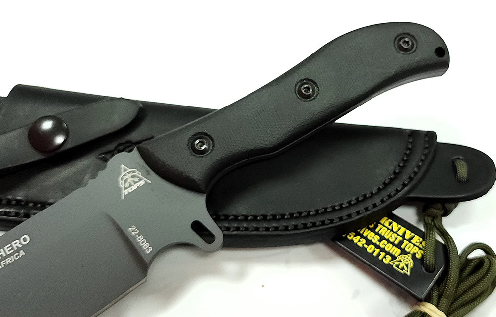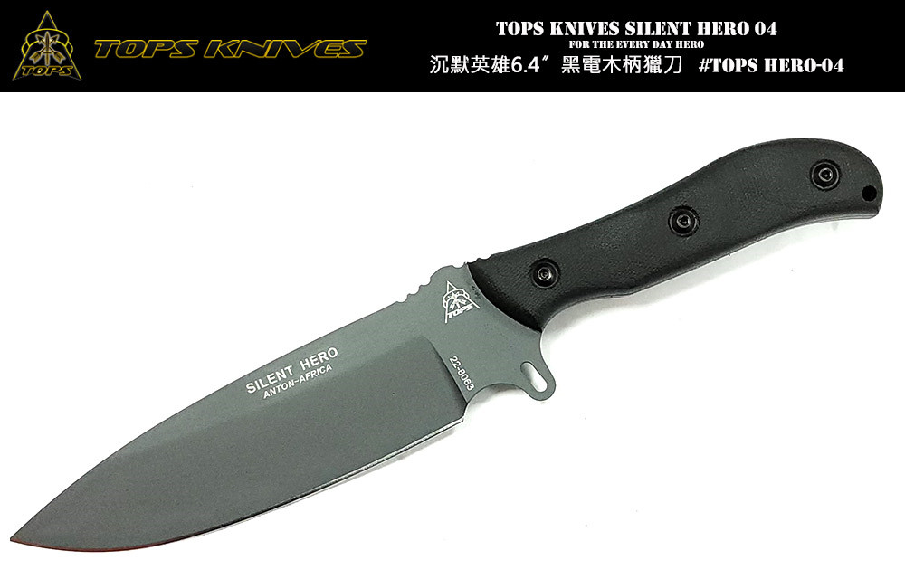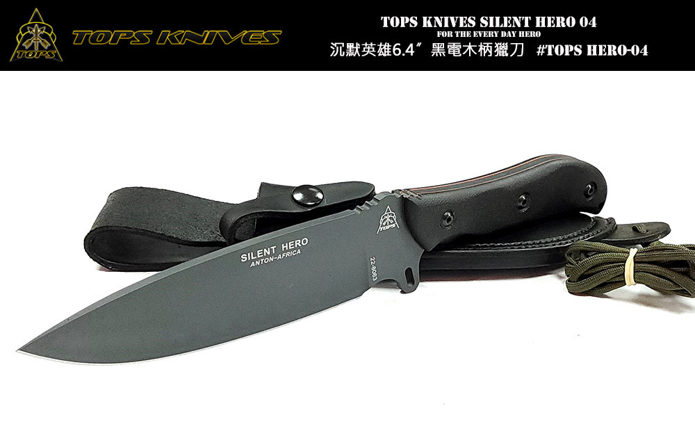 生存和戰術目的而存在戰術獵刀系列。Tops Knives SILENT HERO獵刀採用 1095 高碳鋼為鋼材加以Cerakote Sniper Grey 處理,刀身一體成形製作,結實無比,搭配電木握柄,握感舒適。同時附有專用皮套,方便安全攜帶。