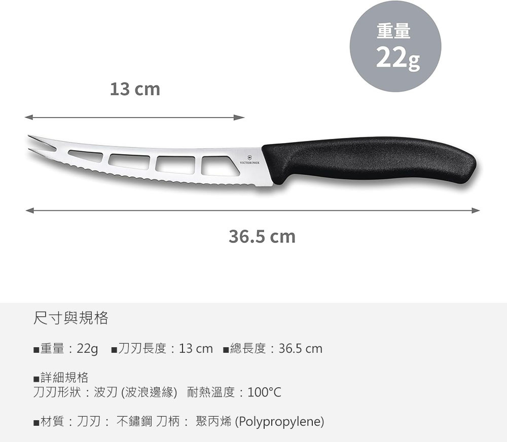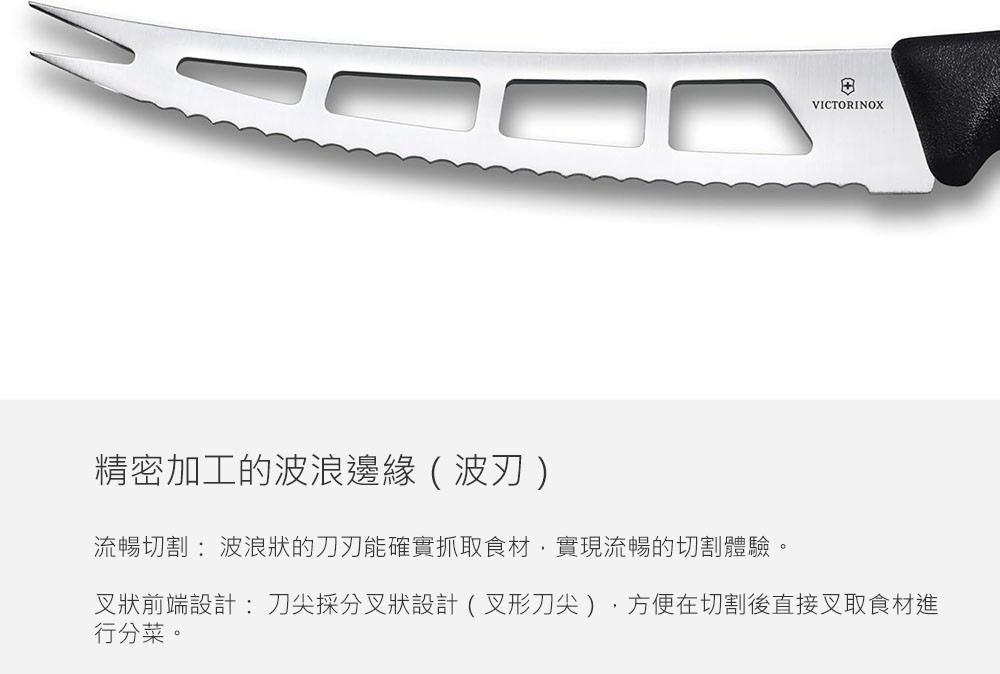 此款刀配備鋒利的波浪形刀刃、刀刃穿孔及叉尖設計,可減少刀刃與食材之間的摩擦阻礙。再加上此刀配備實用的人體工學手柄設計,方便您輕鬆舒適地切割和分配食材份量。瑞士製造,可用洗碗機清洗,設計方便耐用。