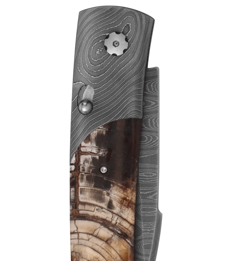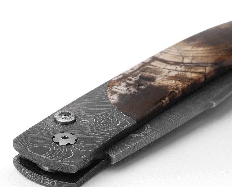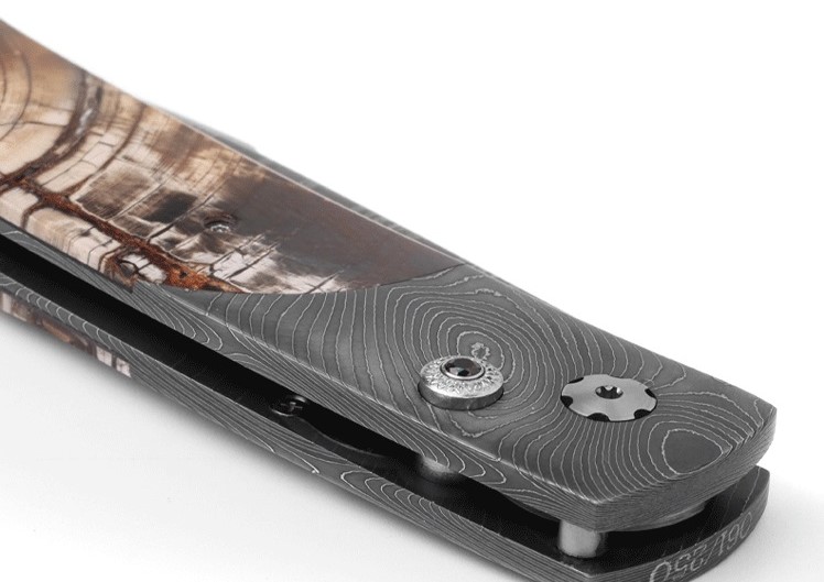 Bolt「Epic」自動開刀器採用Chad Nichols手工鍛造的「Twist」大馬士革鋼框架,並鑲嵌著一顆精美的、擁有一萬年歷史的猛獁象牙化石。刀刃則採用Chad Nichols手工鍛造的「Meadows」大馬士革鋼。單手按鈕鎖上鑲嵌著一顆尖晶石。