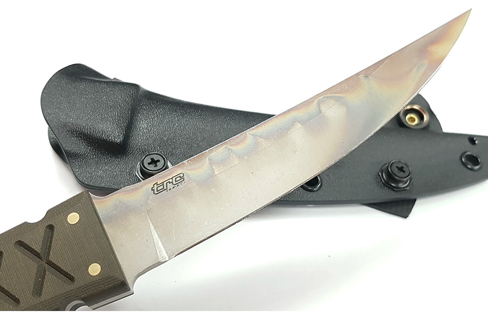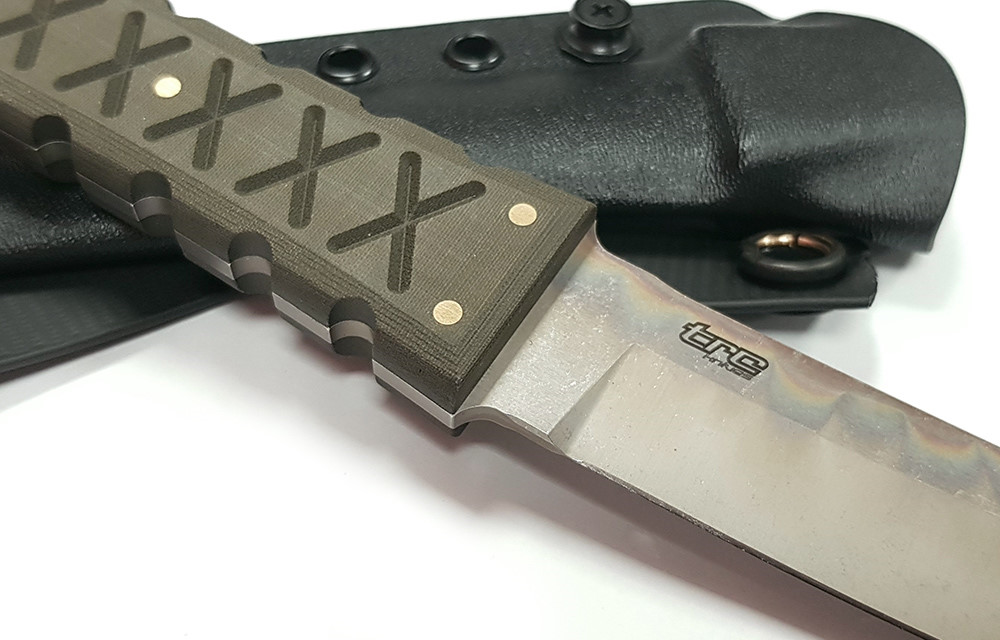 ●綠色亞麻Micarta刀柄保持著美麗的橄欖綠色澤,與黃銅鉚釘完美搭配。這是我們迄今為止與TRC合作打造的最精美的組合之一。