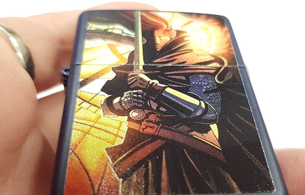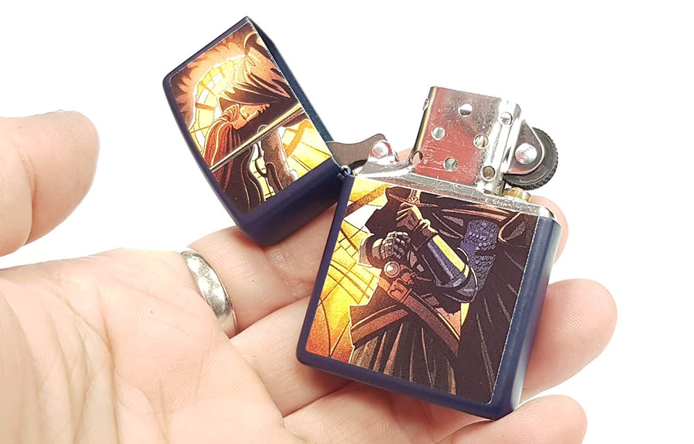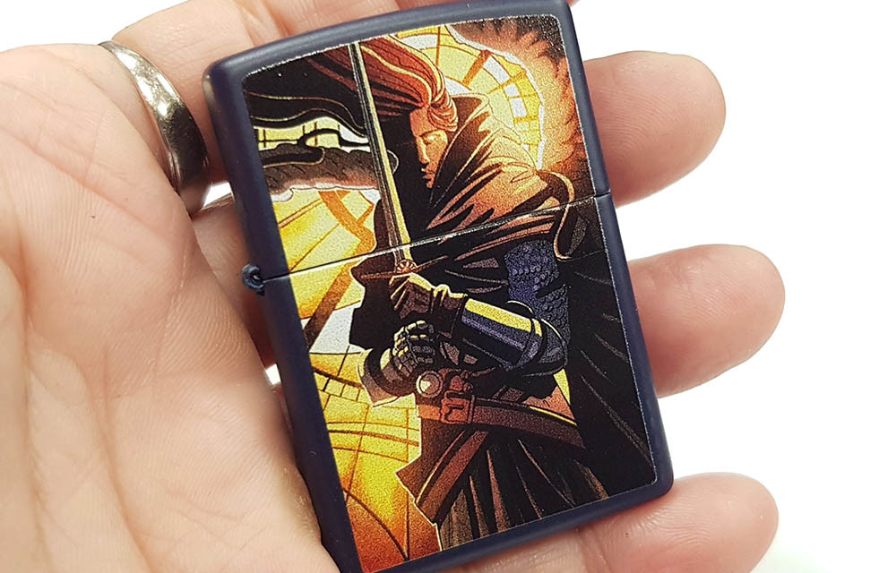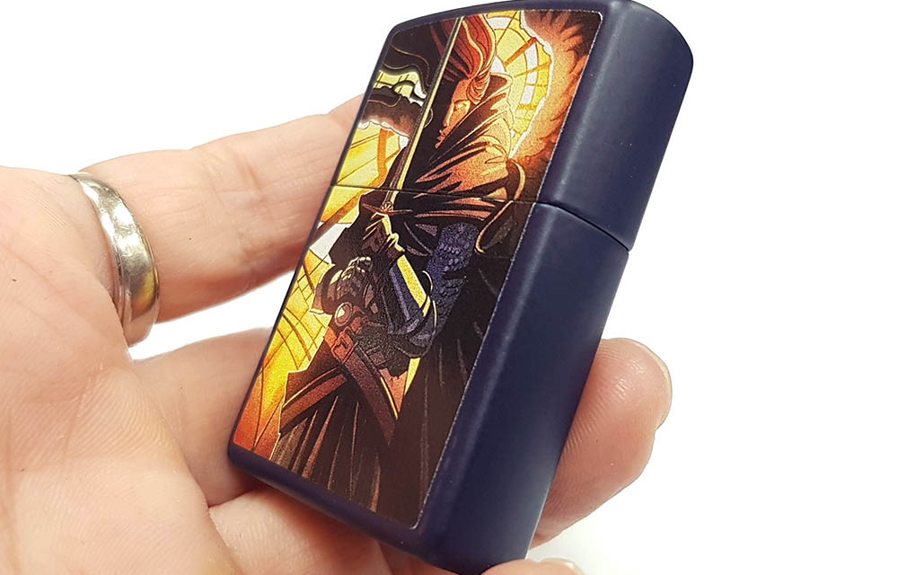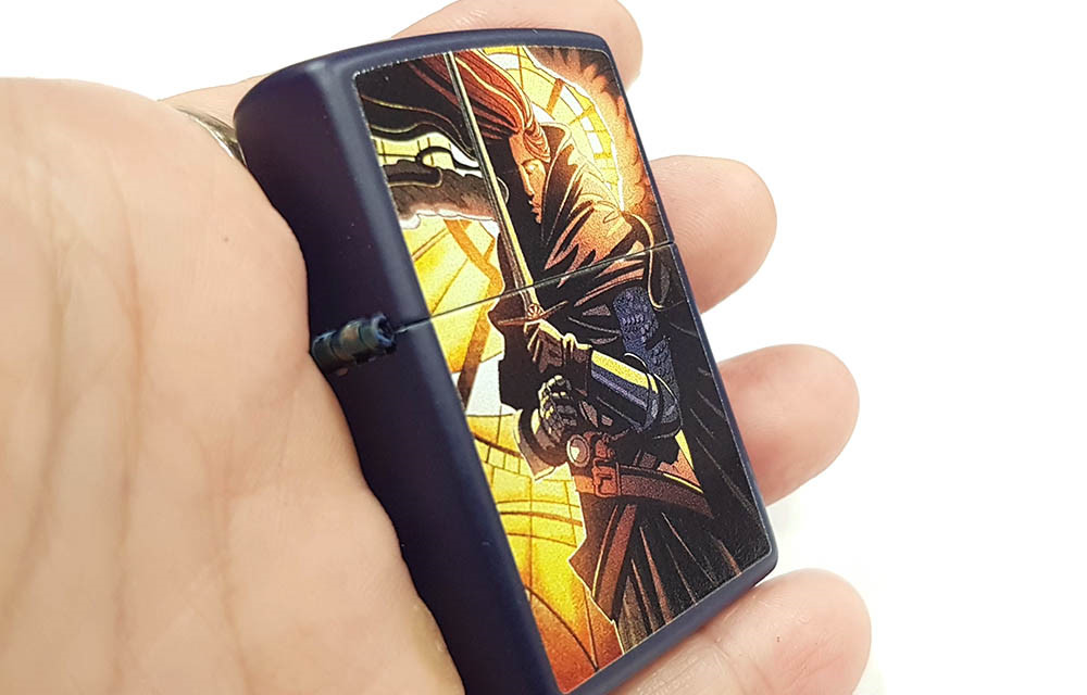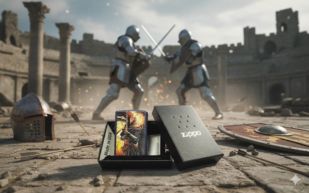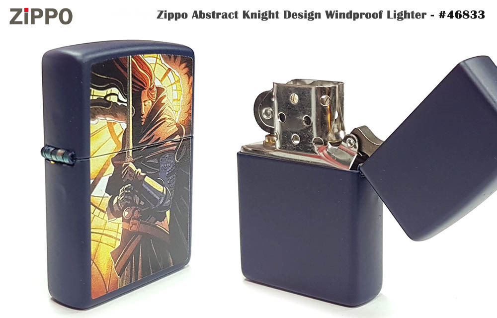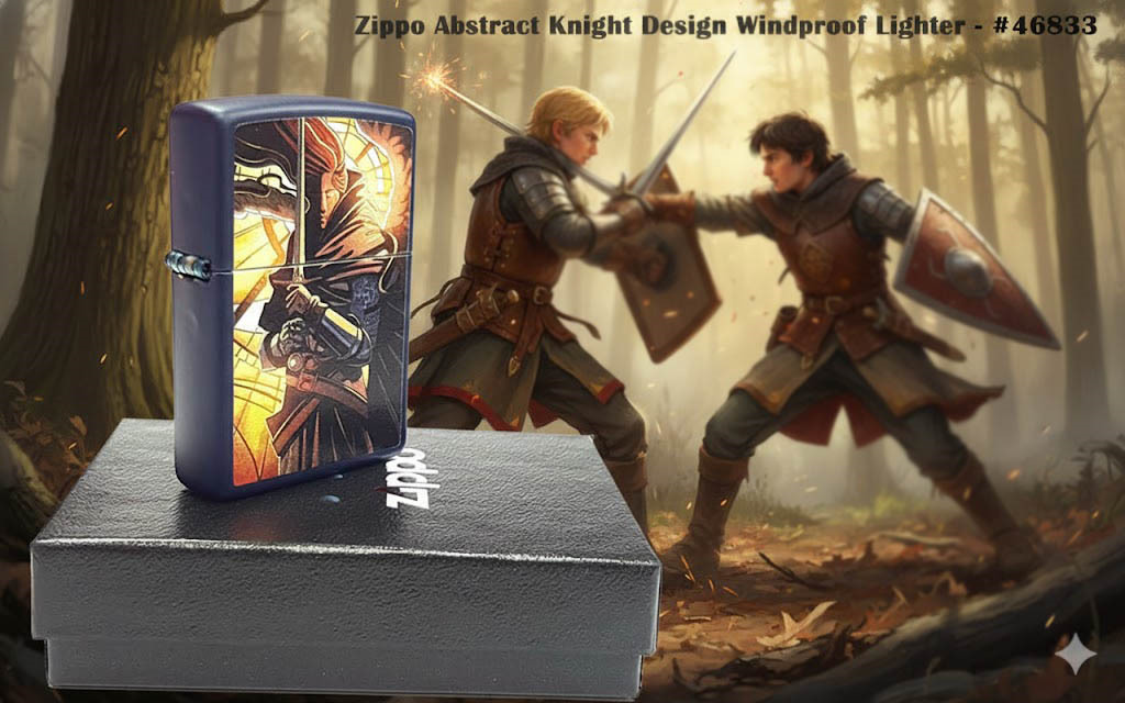 這款經典的霧面海軍藍打火機,將現代與中世紀風格完美融合。抽象的彩色圖案設計中,一位身披鎧甲的戰士在柔和的燈光下蓄勢待發,準備投入戰鬥。