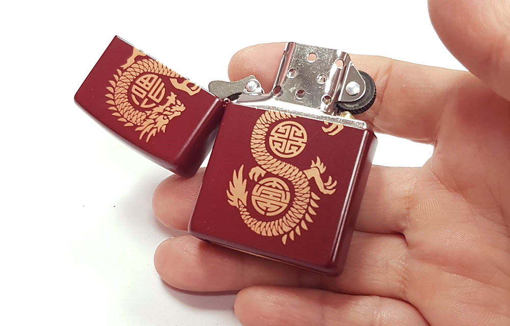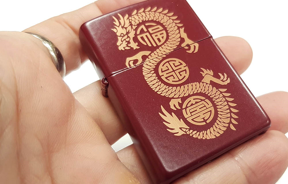 這款經典的梅洛色打火機上雷射雕刻著象徵力量、財富和蛻變的傳統龍形圖案。這是一款充滿東方文化元素與大氣色調的特色打火機。